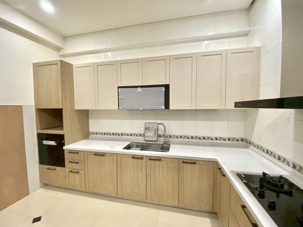 門板:系統框型門 (W552T9艾夏櫚木(下)、3199SM奶茶消光(上))